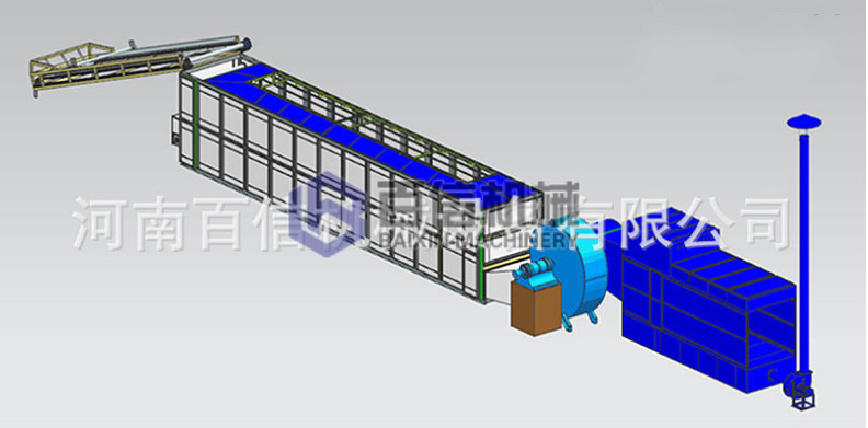 2、烘干機構造 網帶式烘干機被稱為穿流式網帶烘干機,熱風從底部由引風機進入烘干機內部進行由下而上穿透式烘干,風量和風量足夠大,使物料能夠充分烘干。投資小、干燥速度快、蒸發能力強;